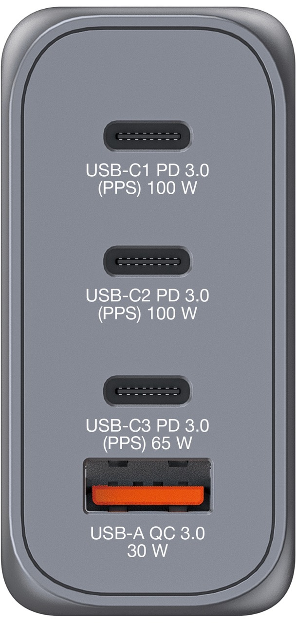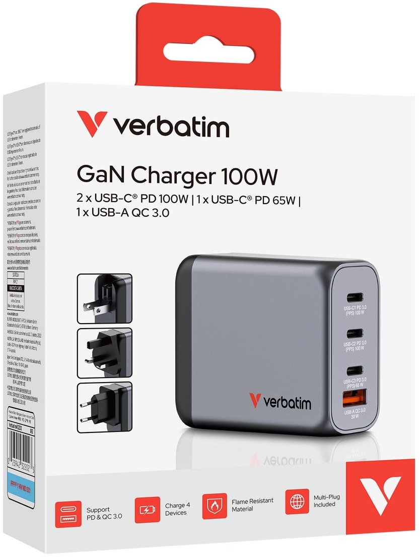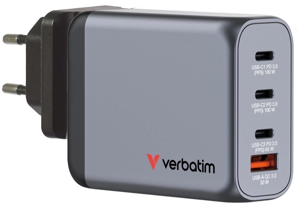 Зарядний пристрій Verbatim 100W 4-Port GaN Wall Charger — це потужний і компактний багатопортовий адаптер, який дозволяє одночасно заряджати до чотирьох пристроїв із загальною потужністю до 100 Вт. Він оснащений двома портами USB-C з підтримкою Power Delivery до 100 Вт кожен, одним USB-C PD на 65 Вт та класичним USB-A з технологією Quick Charge 3.0 до 30 Вт. Завдяки інноваційній технології GaN (нітрид галію) пристрій забезпечує надшвидку зарядку з мінімальним нагріванням, що робить його значно ефективнішим і компактнішим порівняно з традиційними зарядками на основі кремнію.