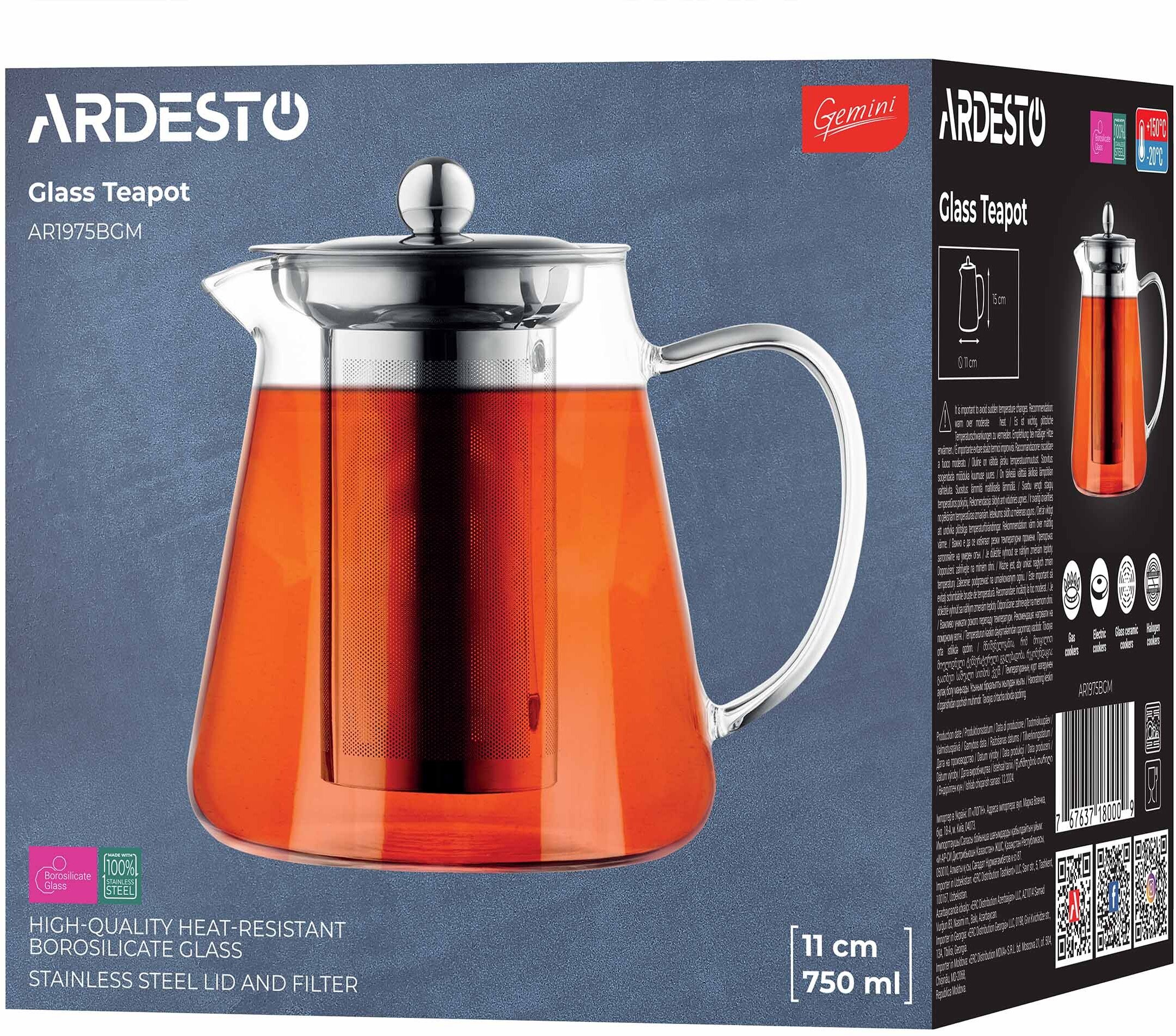 Заварник виготовлено з екологічного боросилікатного скла, яке вирізняється міцністю і стійкістю до перепадів температури, цей заварник гарантує тривале слугування і безпечне використання. Зручне ситечко з нержавіючої сталі надійно утримує всередині чайне листя листя. Об’єму 750 мл достатньо, щоби втамувати спрагу в спеку або зігрітися під час холодів. Заварник можна мити в посудомийній машині, а також підігрівати на помірному вогні. ARDESTO Gemini Milano згодиться для різних видів плит (газових, електричних, склокерамічних, галогенних).