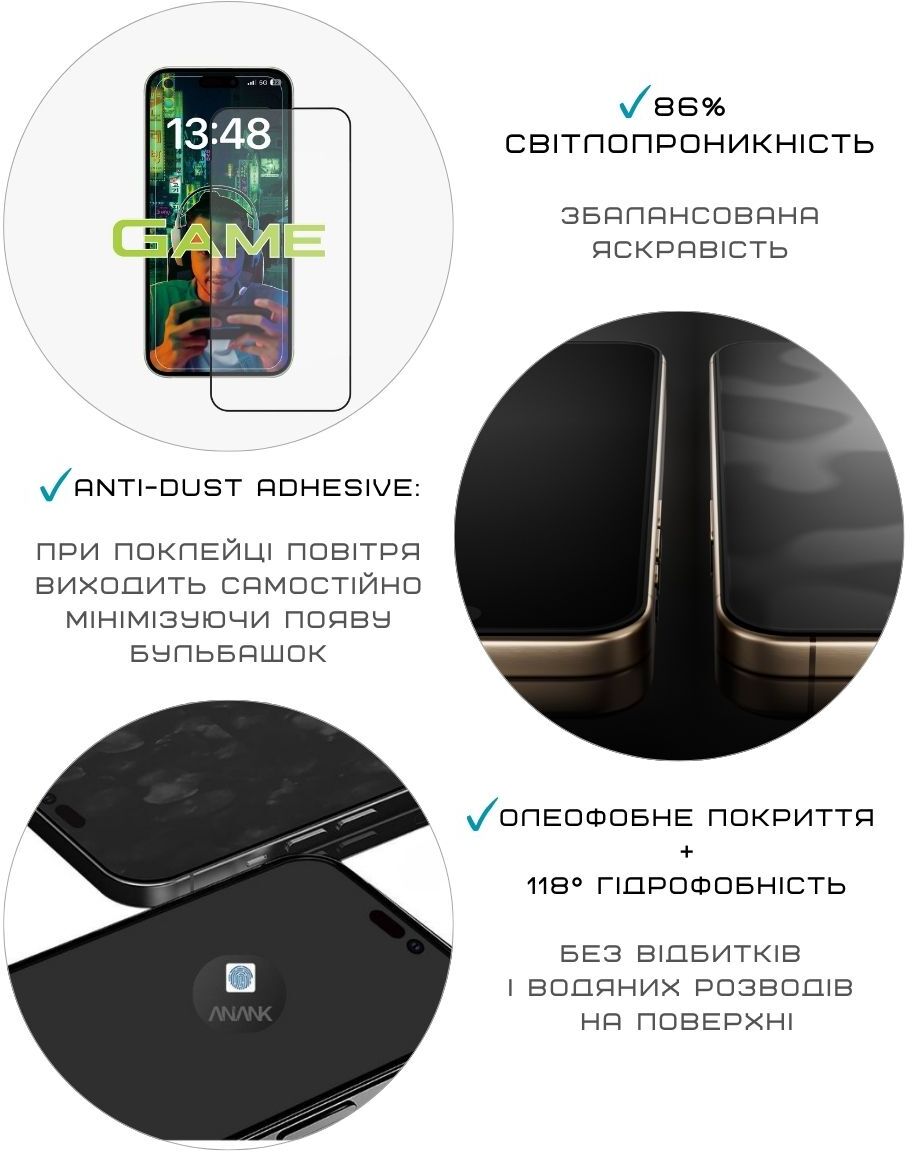 Завдяки технології 2.5D з заокругленими краями скло ідеально прилягає до екрана, не піднімається при використанні більшості оригінальних чохлів та забезпечує захист від повсякденних подряпин і ударів. Антипиловий клейовий шар дозволяє встановлювати скло без бульбашок повітря — частинки пилу не потрапляють під нього, а невеликі бульбашки виходять самостійно протягом кількох годин. Усе це робить Anank 2.5D Anti-Fingerprint практичним і довговічним рішенням для тих, хто цінує комфорт, чистоту екрана та надійний захист без компромісів у зручності користування.