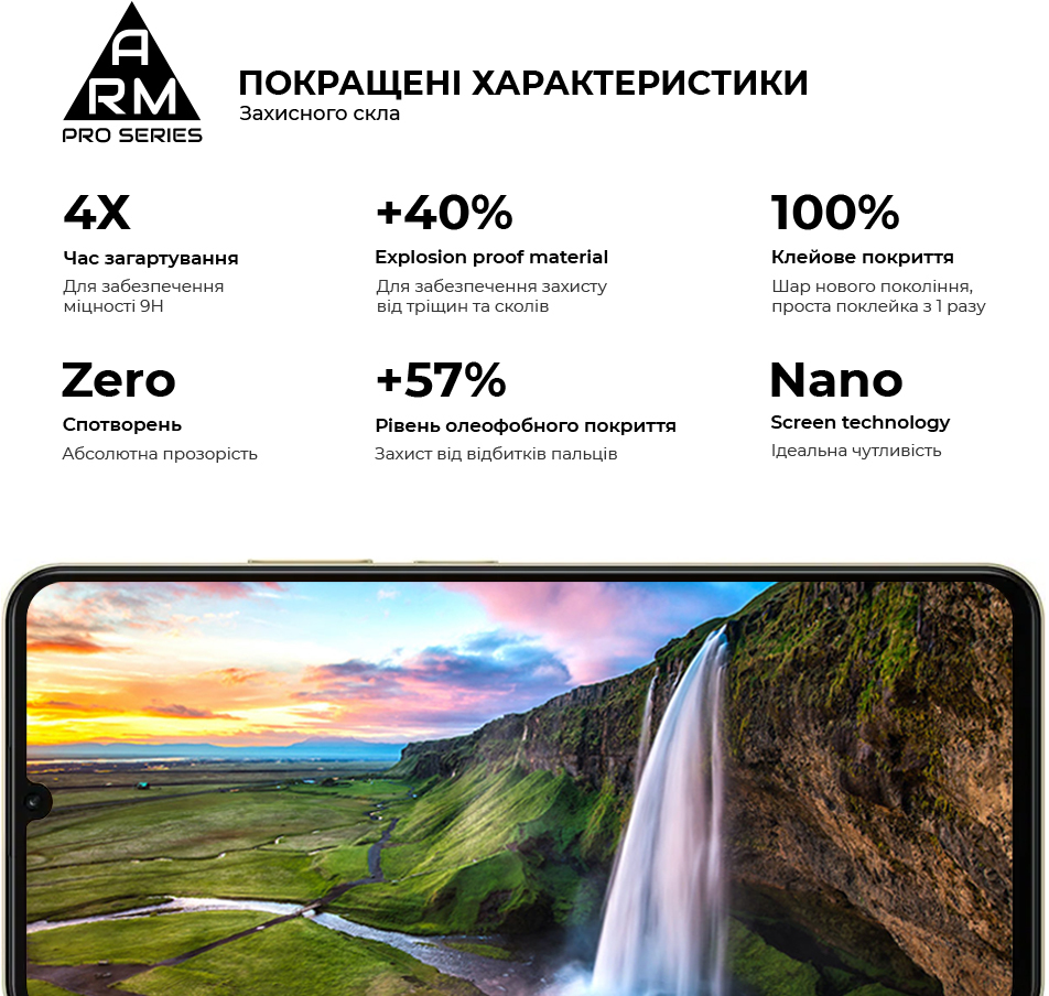 Верхня частина скла містить покращене олеофобне й гідрофобне покриття. Під час використання скла це забезпечує природні тактильні відчуття — пальці легко ковзають по поверхні. Водночас зображення відбивається з автентичною яскравістю й чіткістю без спотворень.