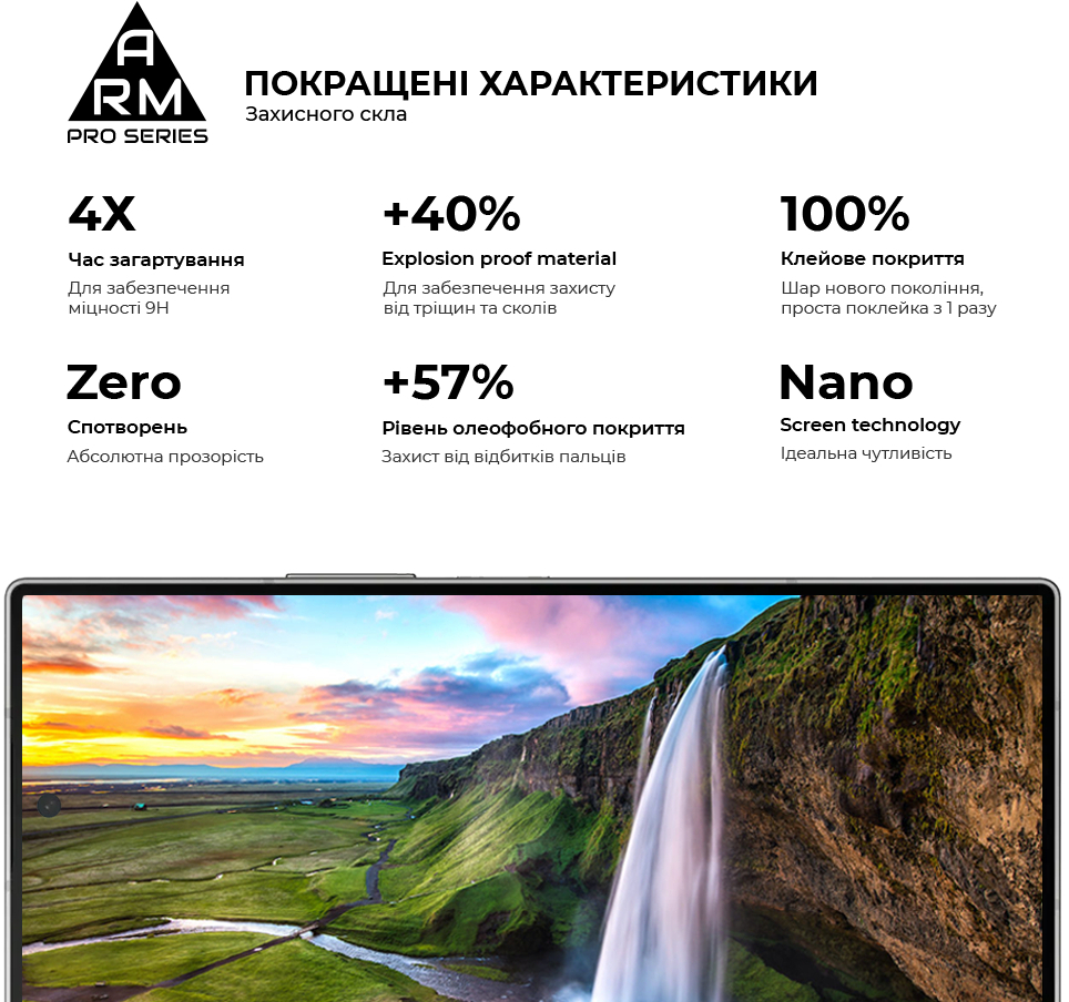 Верхня частина скла містить покращене олеофобне й гідрофобне покриття. Під час використання скла це забезпечує природні тактильні відчуття - пальці легко ковзають по поверхні. Водночас зображення відбивається з автентичною яскравістю й чіткістю без спотворень.