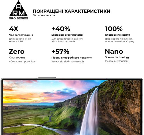 Захисне скло Armorstandart Pro Series має оптимальні габарити та товщину на 0,3 мм. Передбачено вирізи під усі датчики, камери та роз'єми.