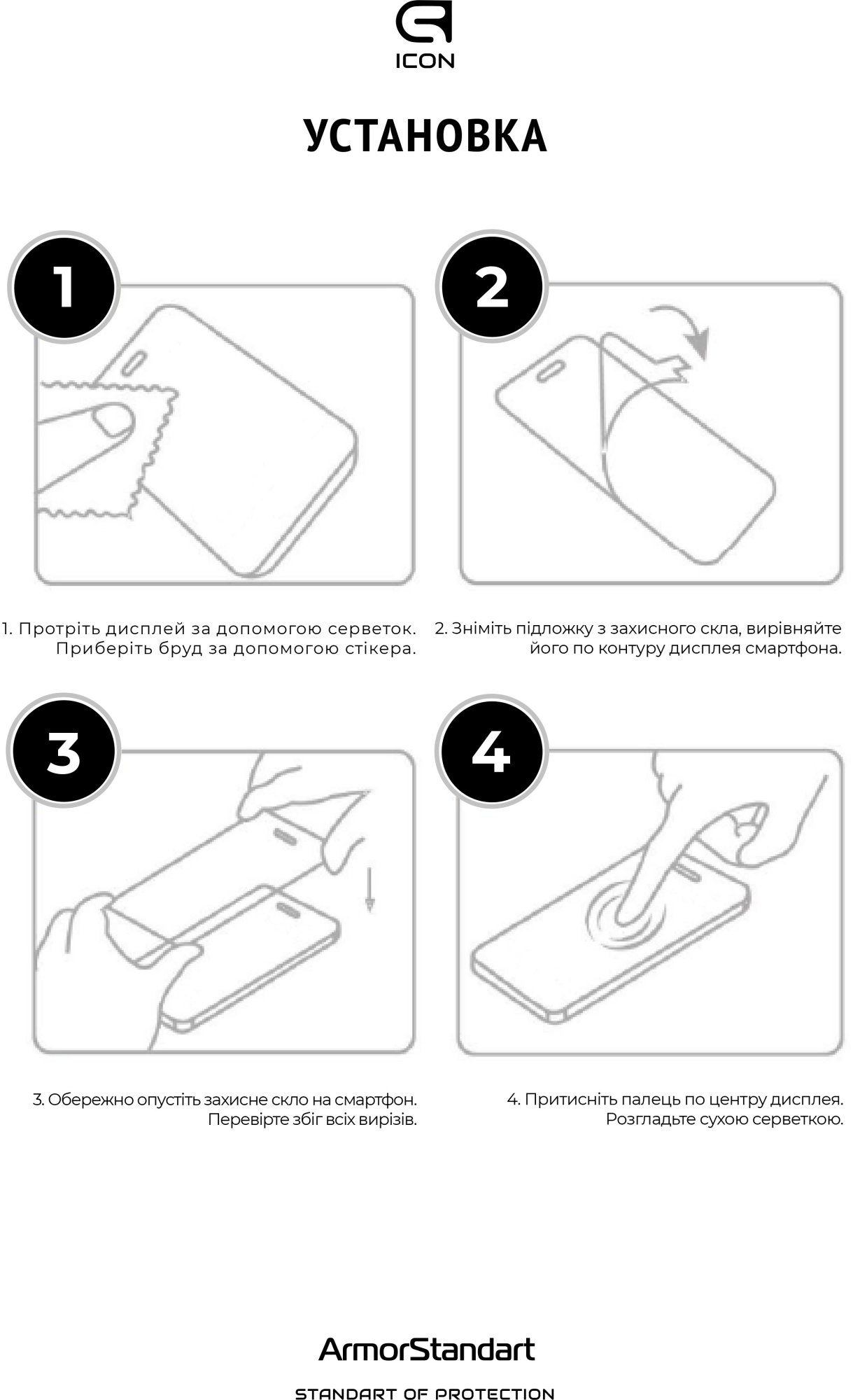 Захисне скло Armorstandart Icon Series має автентичні габарити та товщину на 0,3 мм. Передбачено вирізи під усі датчики, камери та роз'єми.