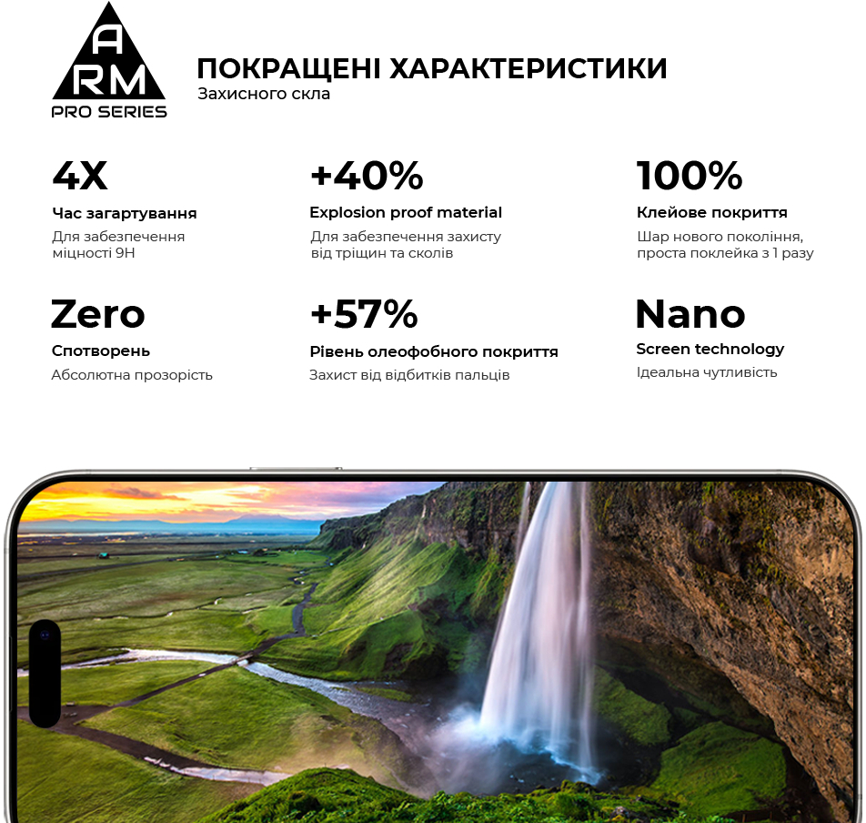 Верхня частина скла містить покращене олеофобне й гідрофобне покриття. Під час використання скла це забезпечує природні тактильні відчуття - пальці легко ковзають по поверхні. Водночас зображення відбивається з автентичною яскравістю й чіткістю без спотворень.