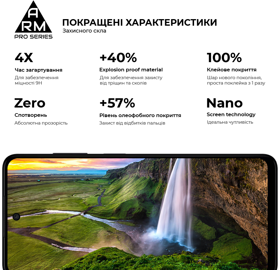 Верхня частина скла містить покращене олеофобне й гідрофобне покриття. Під час використання скла це забезпечує природні тактильні відчуття - пальці легко ковзають по поверхні. Водночас зображення відбивається з автентичною яскравістю й чіткістю без спотворень.