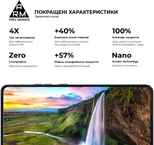 Захисне скло Armorstandart Pro Series має оптимальні габарити та товщину на 0,3 мм. Передбачено вирізи під усі датчики, камери та роз'єми.