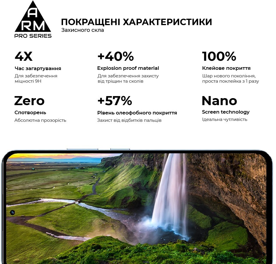 Верхня частина скла містить покращене олеофобне й гідрофобне покриття. Під час використання скла це забезпечує природні тактильні відчуття - пальці легко ковзають по поверхні. Водночас зображення відбивається з автентичною яскравістю й чіткістю без спотворень.