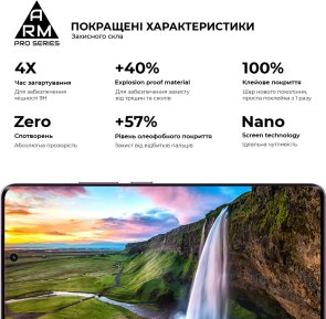Захисне скло Armorstandart Pro Series має оптимальні габарити та товщину на 0,3 мм. Передбачено вирізи під усі датчики, камери та роз'єми.