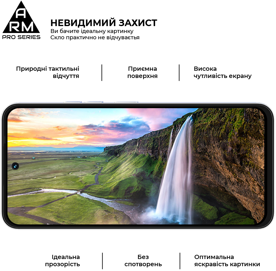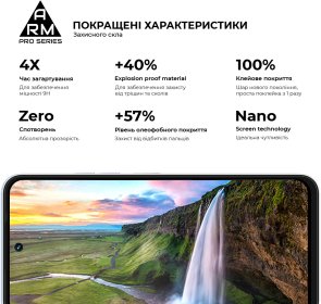 Верхня частина скла містить покращене олеофобне й гідрофобне покриття. Під час використання скла це забезпечує природні тактильні відчуття - пальці легко ковзають по поверхні. Водночас зображення відбивається з автентичною яскравістю й чіткістю без спотворень.