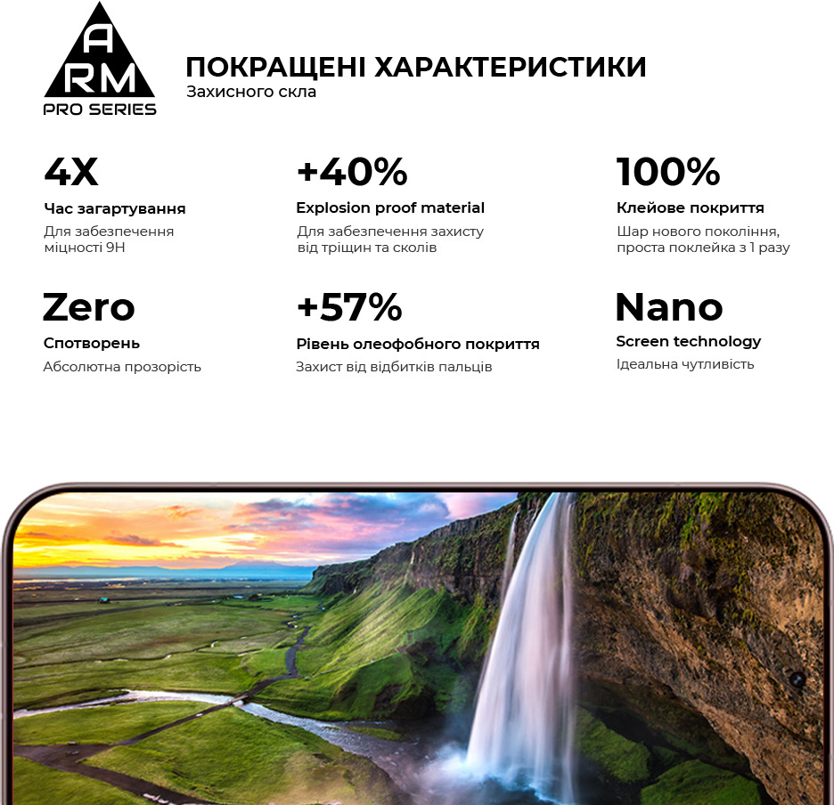 Верхня частина скла містить покращене олеофобне й гідрофобне покриття. Під час використання скла це забезпечує природні тактильні відчуття - пальці легко ковзають по поверхні. Водночас зображення відбивається з автентичною яскравістю й чіткістю без спотворень.