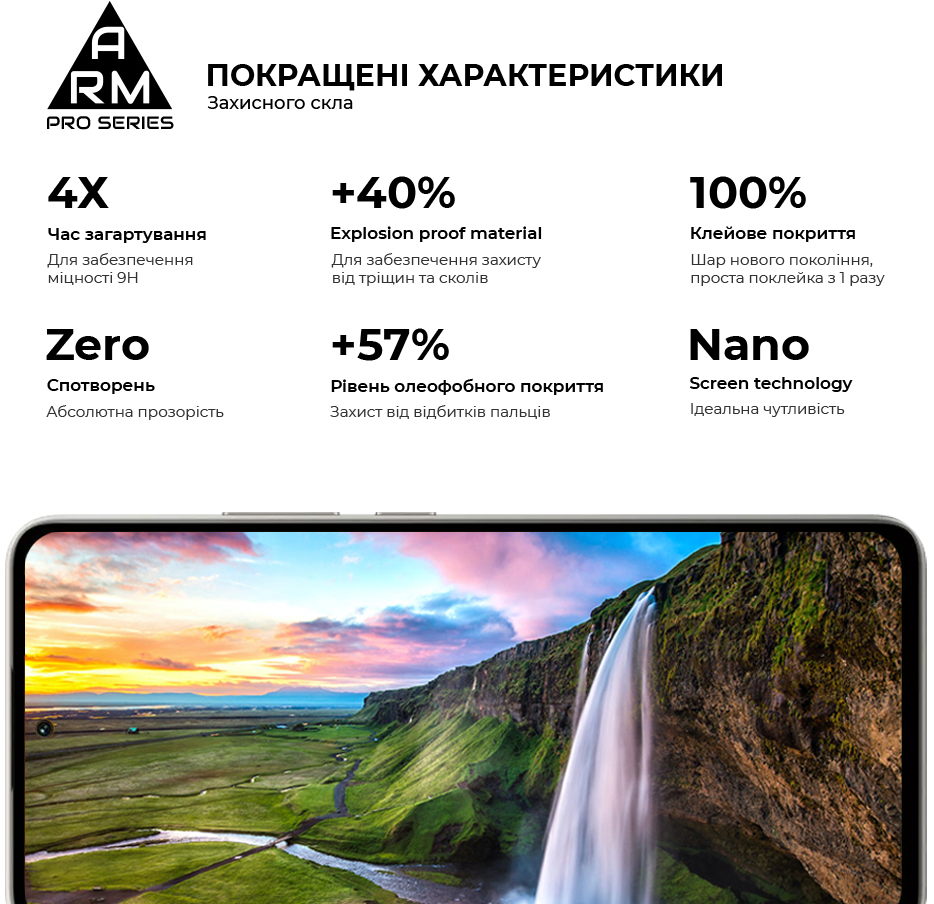 Верхня частина скла містить покращене олеофобне й гідрофобне покриття. Під час використання скла це забезпечує природні тактильні відчуття - пальці легко ковзають по поверхні. Водночас зображення відбивається з автентичною яскравістю й чіткістю без спотворень.