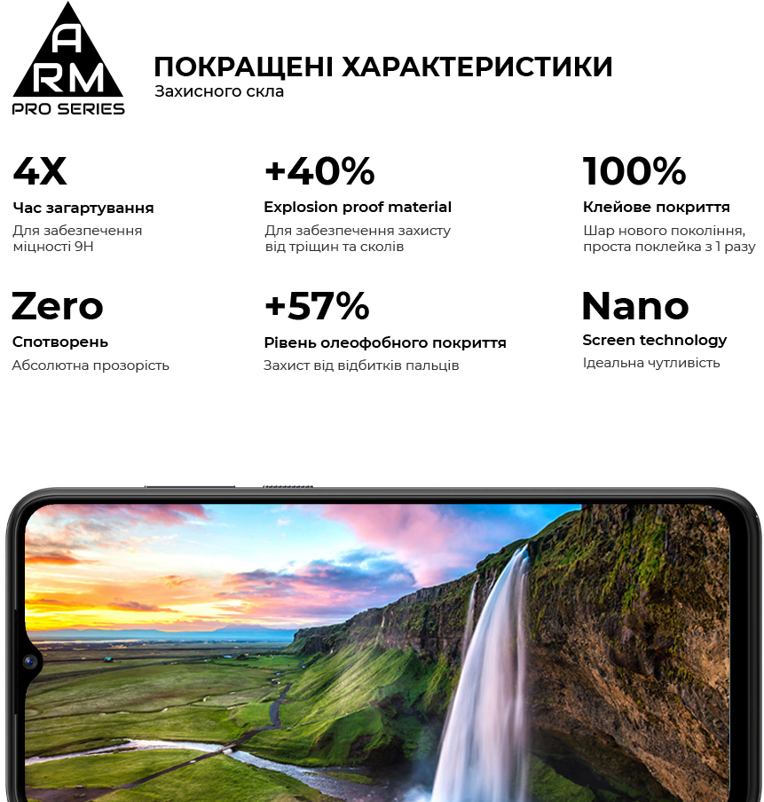 Верхня частина скла містить покращене олеофобне й гідрофобне покриття. Під час використання скла це забезпечує природні тактильні відчуття - пальці легко ковзають по поверхні. Водночас зображення відбивається з автентичною яскравістю й чіткістю без спотворень.