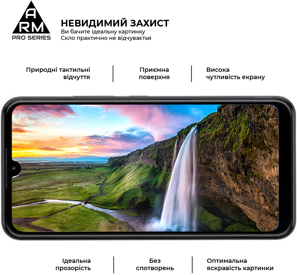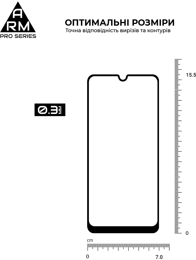 Захисне скло Armorstandart Pro Series має оптимальні габарити та товщину на 0,3 мм. Передбачено вирізи під усі датчики, камери та роз'єми.