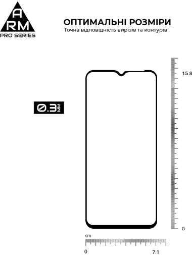Захисне скло Armorstandart Pro Series має оптимальні габарити та товщину на 0,3 мм. Передбачено вирізи під усі датчики, камери та роз'єми.