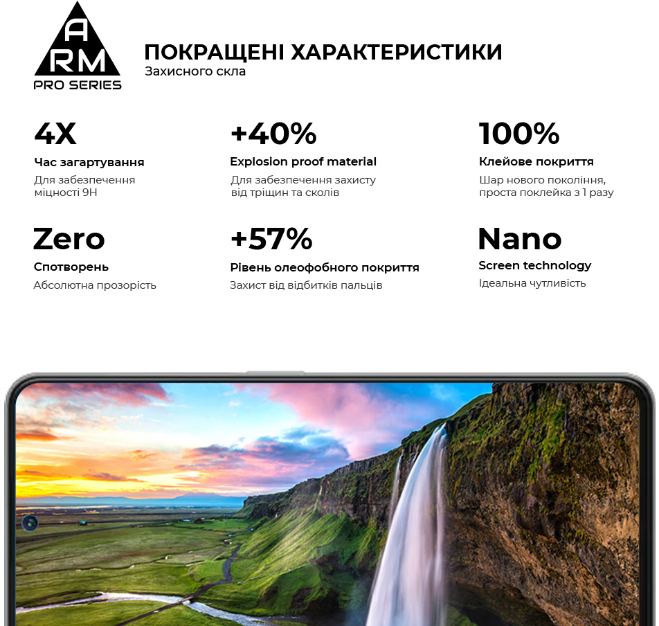 Верхня частина скла містить покращене олеофобне й гідрофобне покриття. Під час використання скла це забезпечує природні тактильні відчуття - пальці легко ковзають по поверхні. Водночас зображення відбивається з автентичною яскравістю й чіткістю без спотворень.
