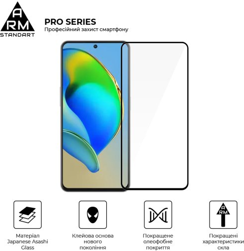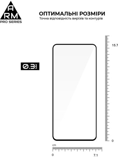 Захисне скло Armorstandart Pro Series має оптимальні габарити та товщину на 0,3 мм. Передбачено вирізи під усі датчики, камери та роз'єми.