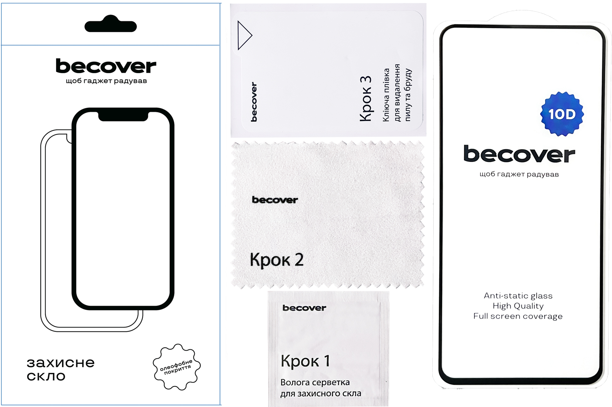 Скло 10D має закруглені краї, що дозволяє йому ідеально прилягати до екрана смартфона, забезпечуючи повний захист без проміжків.