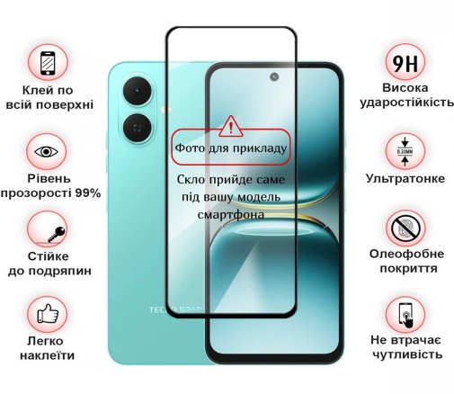 - повне покриття: скло 10D має закруглені краї, що дозволяє йому ідеально прилягати до екрана смартфона, забезпечуючи повний захист без проміжків.