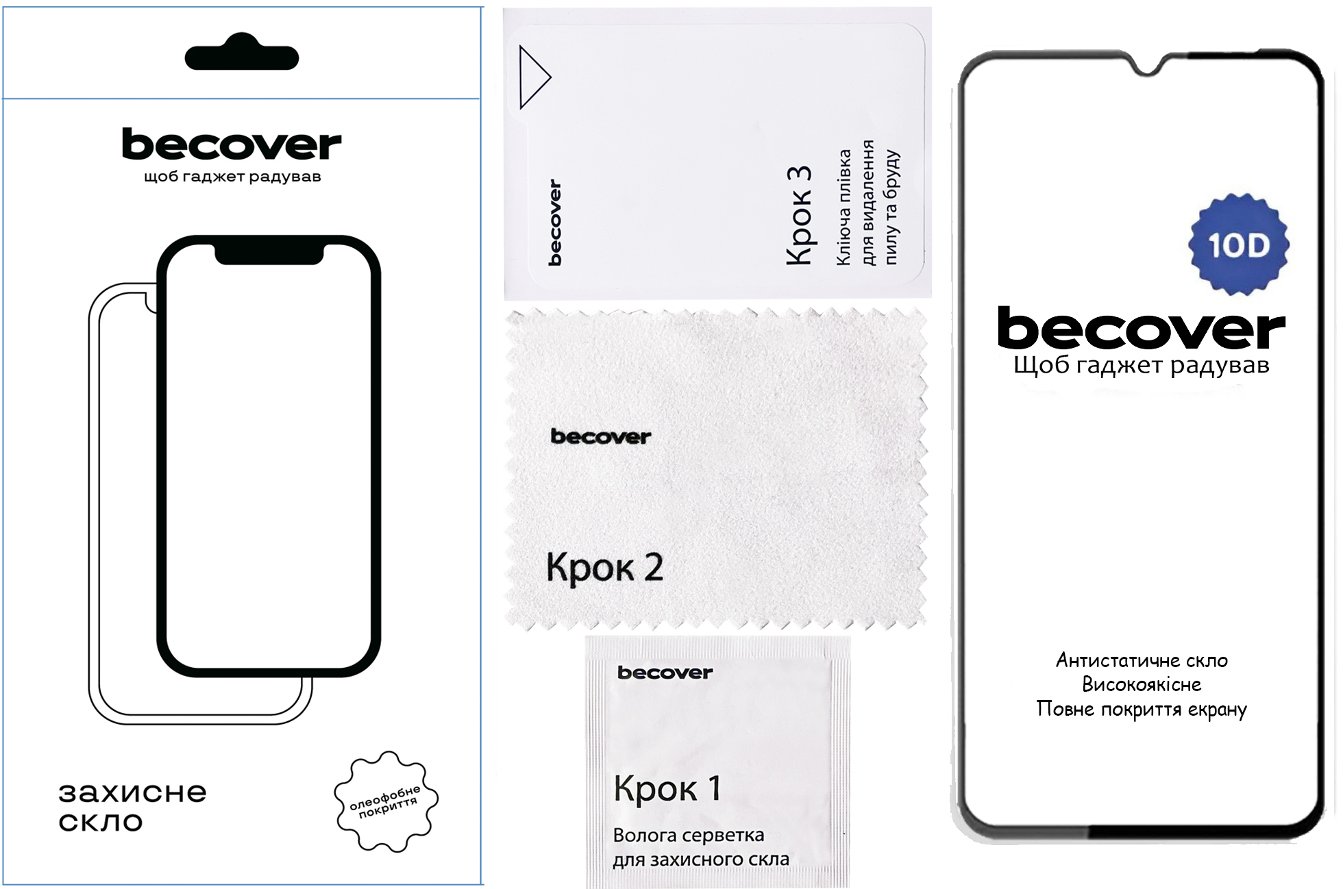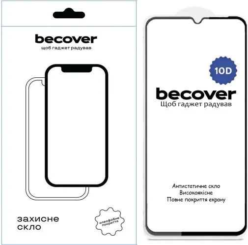 Скло 10D має закруглені краї, що дозволяє йому ідеально прилягати до екрана смартфона, забезпечуючи повний захист без проміжків.