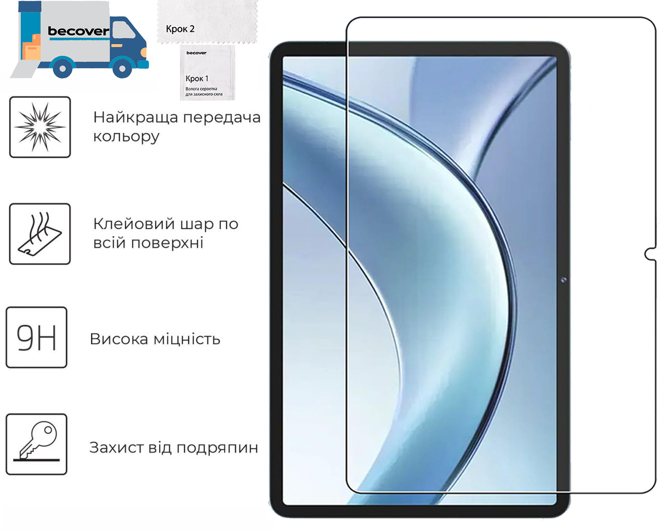 "Надміцне, ультратонке та абсолютно прозоре захисне скло забезпечить збереження екрана вашого планшета. Протектор із загартованого скла принципово відрізняється від традиційних захисних плівок і перевершує їх по ряду ключових характеристик: