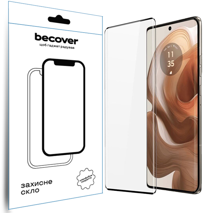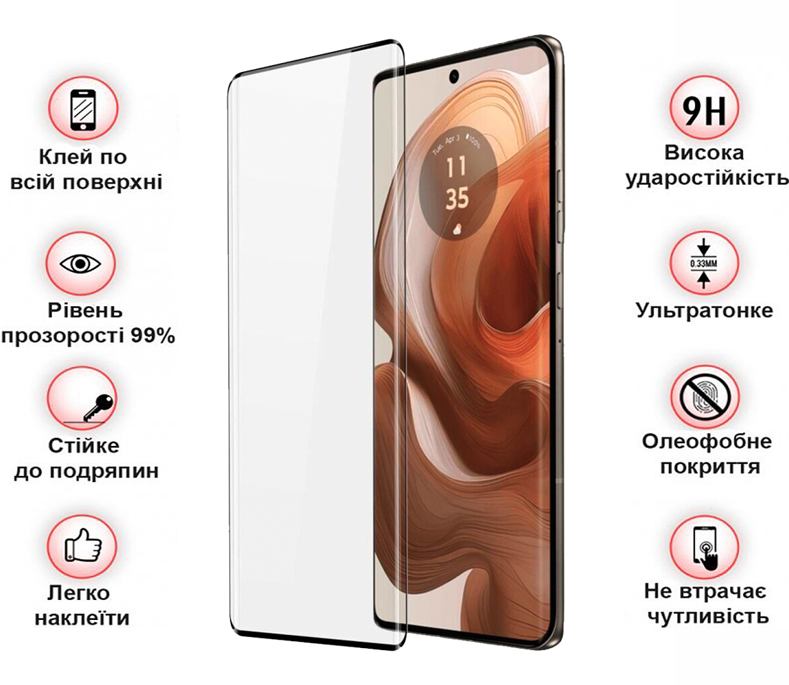 3D вигин: Скло ідеально повторює контури екрана, покриваючи всю його поверхню, включаючи вигнуті краї.