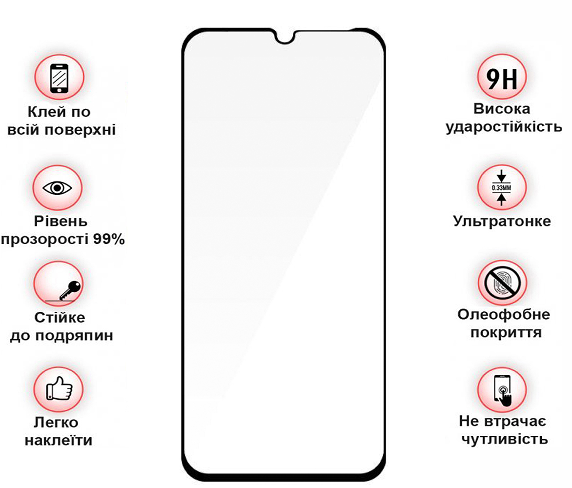 - Ступінь міцності 9H - супер захист екрану, твердий поверхневий шар запобігає появленню тріщин, сколів, попаданню вологи та іншим пошкодженням, при цьому зберігаючи ваш екран абсолютно новим;