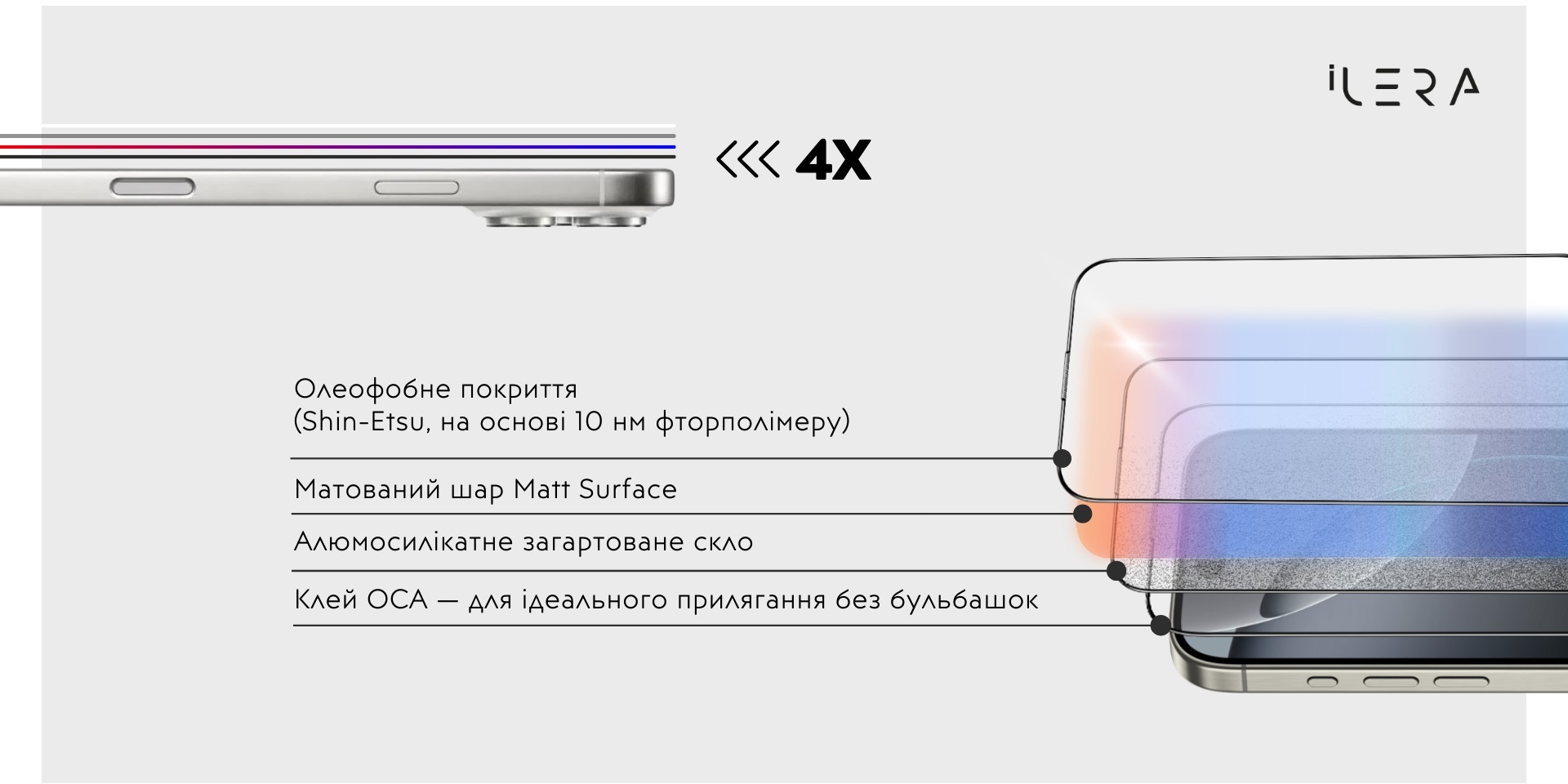 iLera FrostedGlass 2.0 — це матове захисне скло для екрана Apple iPhone 17 Pro, призначена для користувачів, які шукають баланс між захистом від подряпин, ударів і матовим ефектом для зменшення відблисків та відбитків пальців.