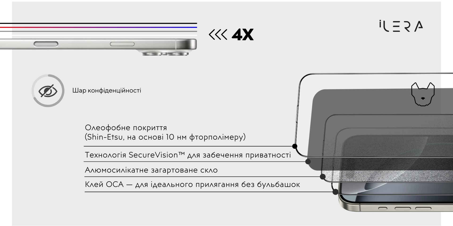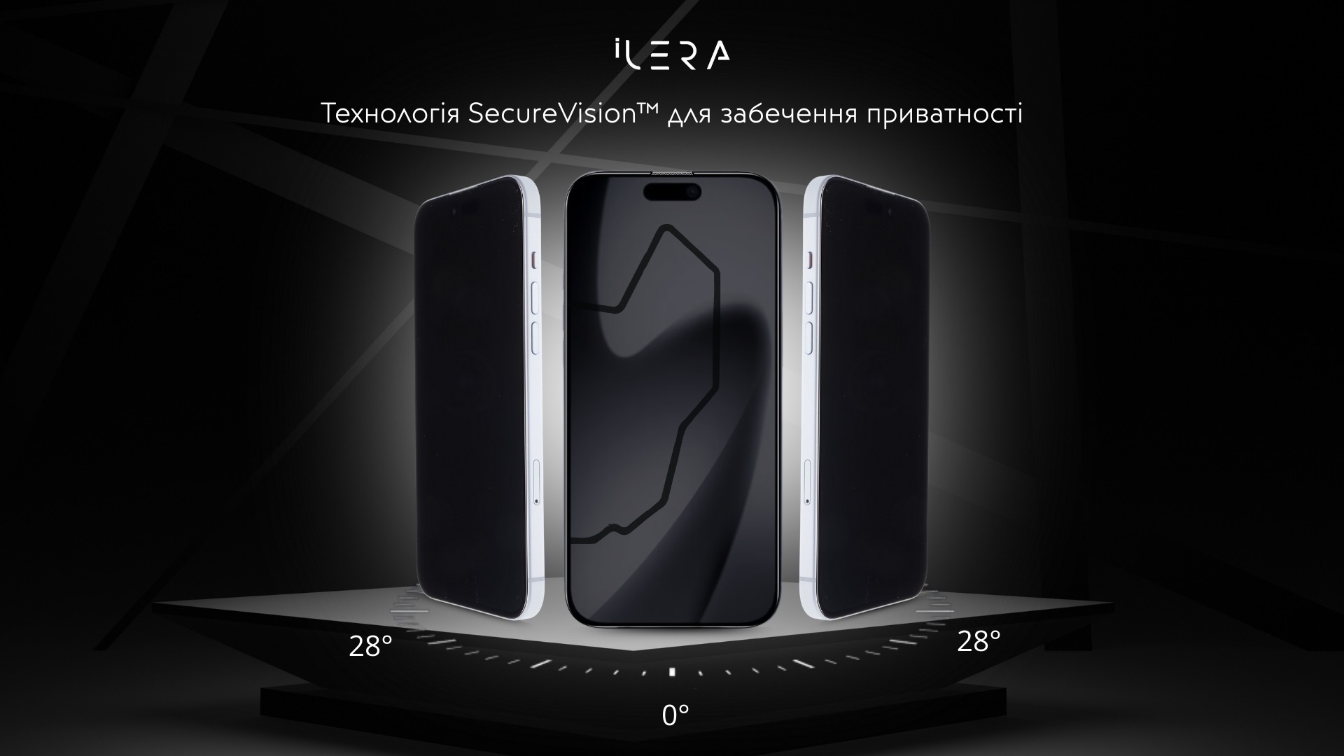 Технологія SecureVision обмежує кут огляду екрана до 28°, роблячи дисплей видимим лише для користувача, зберігаючи яскравість і чіткість кольорів без компромісів. Скло ідеально відповідає контурам iPhone завдяки лазерній точності, забезпечуючи безшовне прилягання без зазорів чи нерівностей, а також повну сумісність із чохлами iLera. Алюмосилікатне загартоване скло товщиною 0,3 мм від Corning High поєднує міцність і оптичну прозорість, не додаючи об’єму. Оптичний клей OCA забезпечує надійну адгезію без бульбашок, зберігаючи якість зображення.