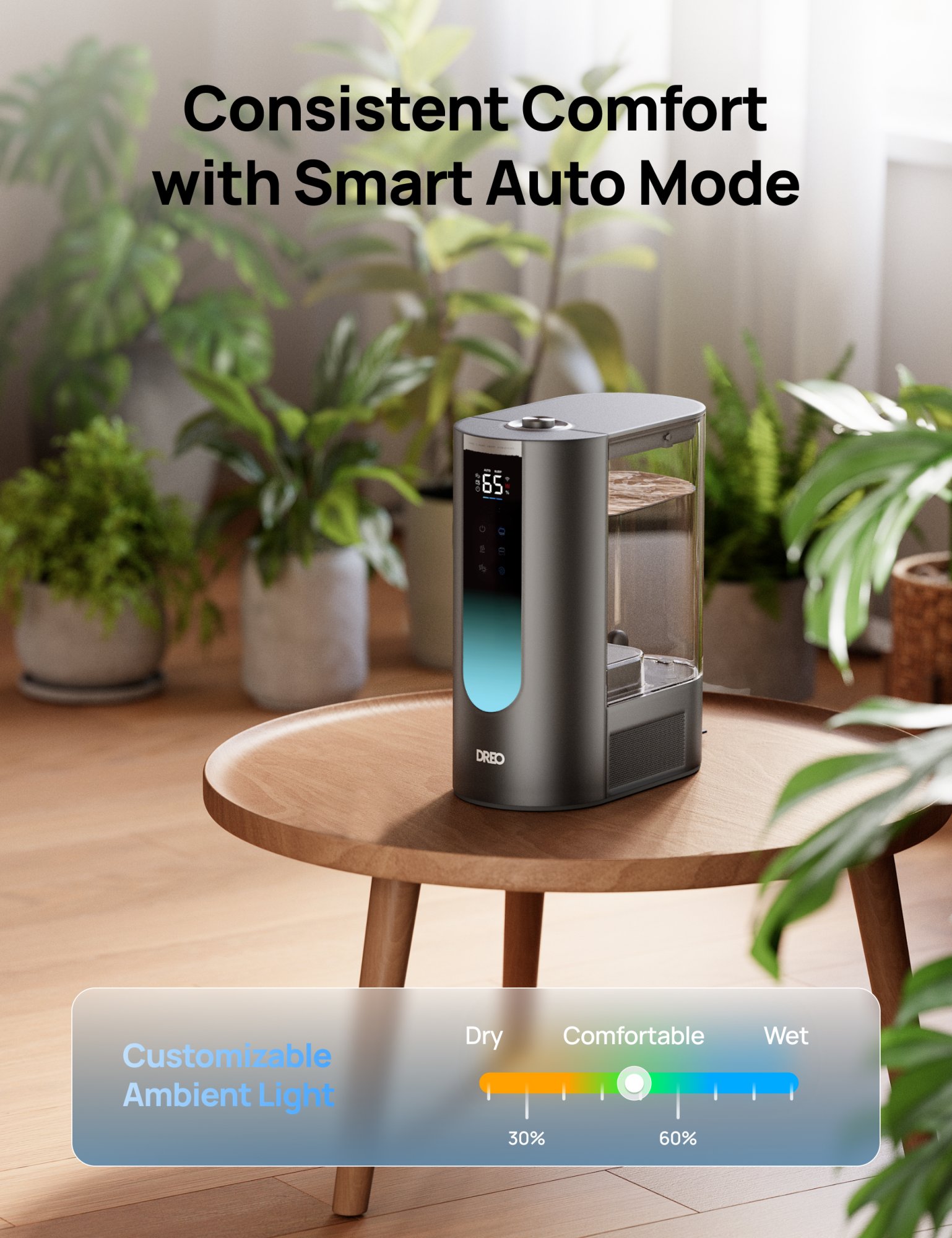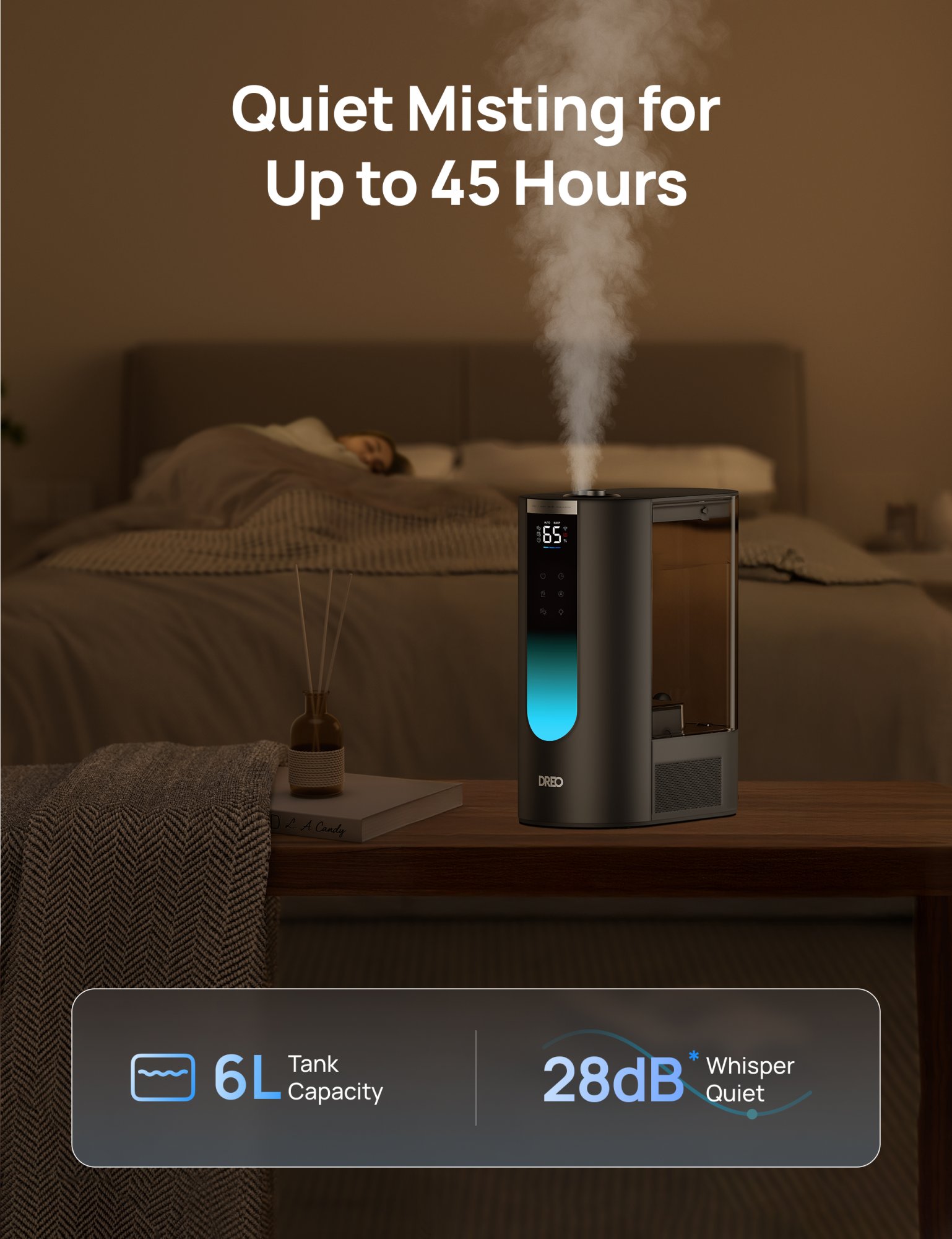Зволожувач повітря Dreo DR-HHM013S — це преміум-пристрій для створення комфортного, здорового мікроклімату в житлових чи робочих приміщеннях. Завдяки місткому баку місткістю 6 літрів, він здатний забезпечити до 45 годин безперервної роботи на одному заповненні, що робить його ідеальним варіантом для спалень, дитячих чи офісів.