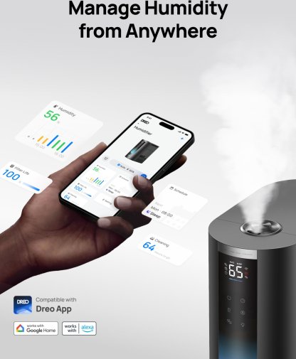 Для комфортного користування передбачено цифрове керування зі сенсорним дисплеєм, а також можливість управління через мобільний додаток чи голосові помічники. Модель має функцію точного контролю вологості (humidistat) і автоматичне регулювання, що дозволяє підтримувати заданий рівень вологості без зайвих дій.